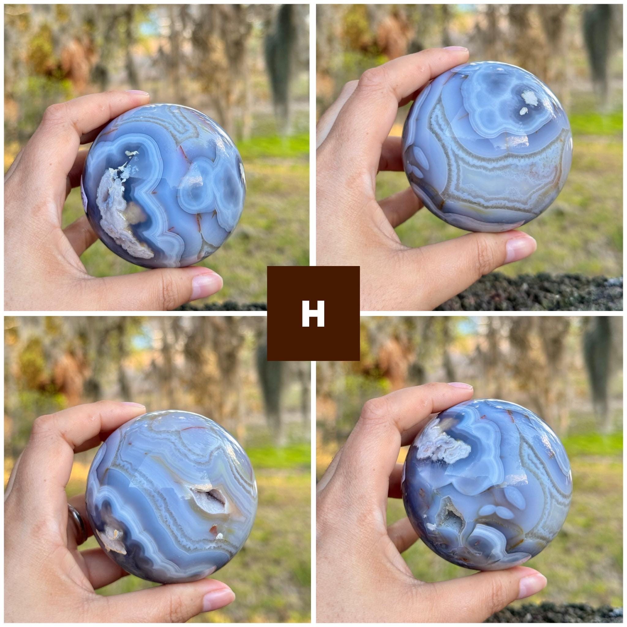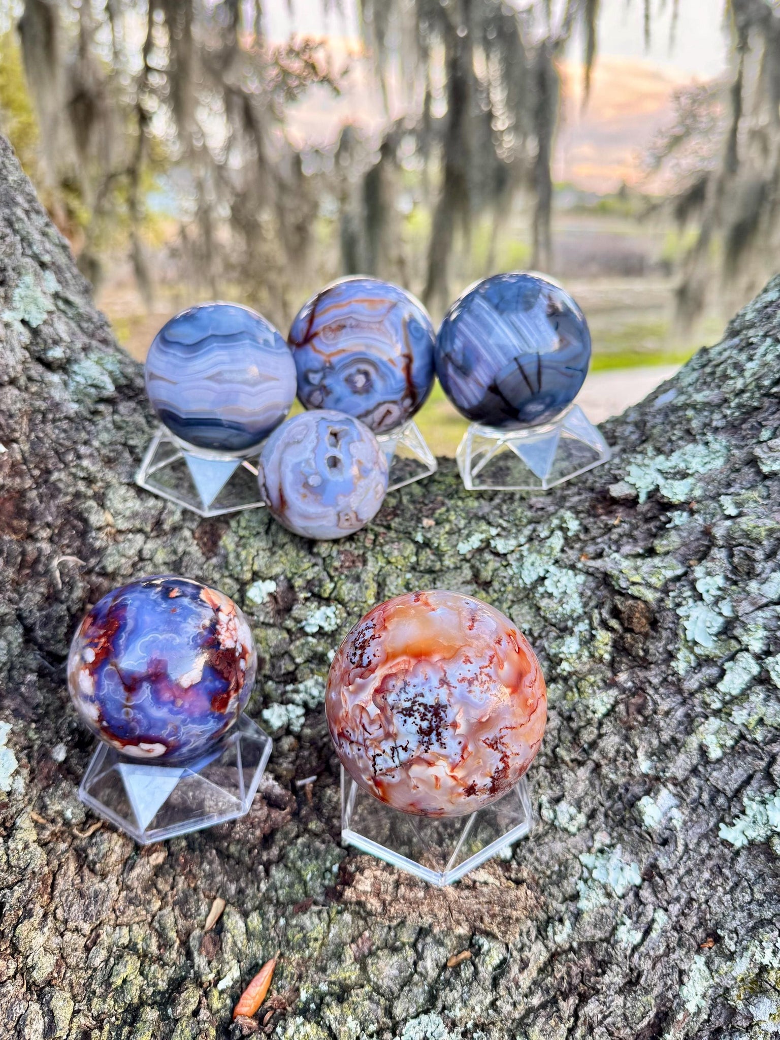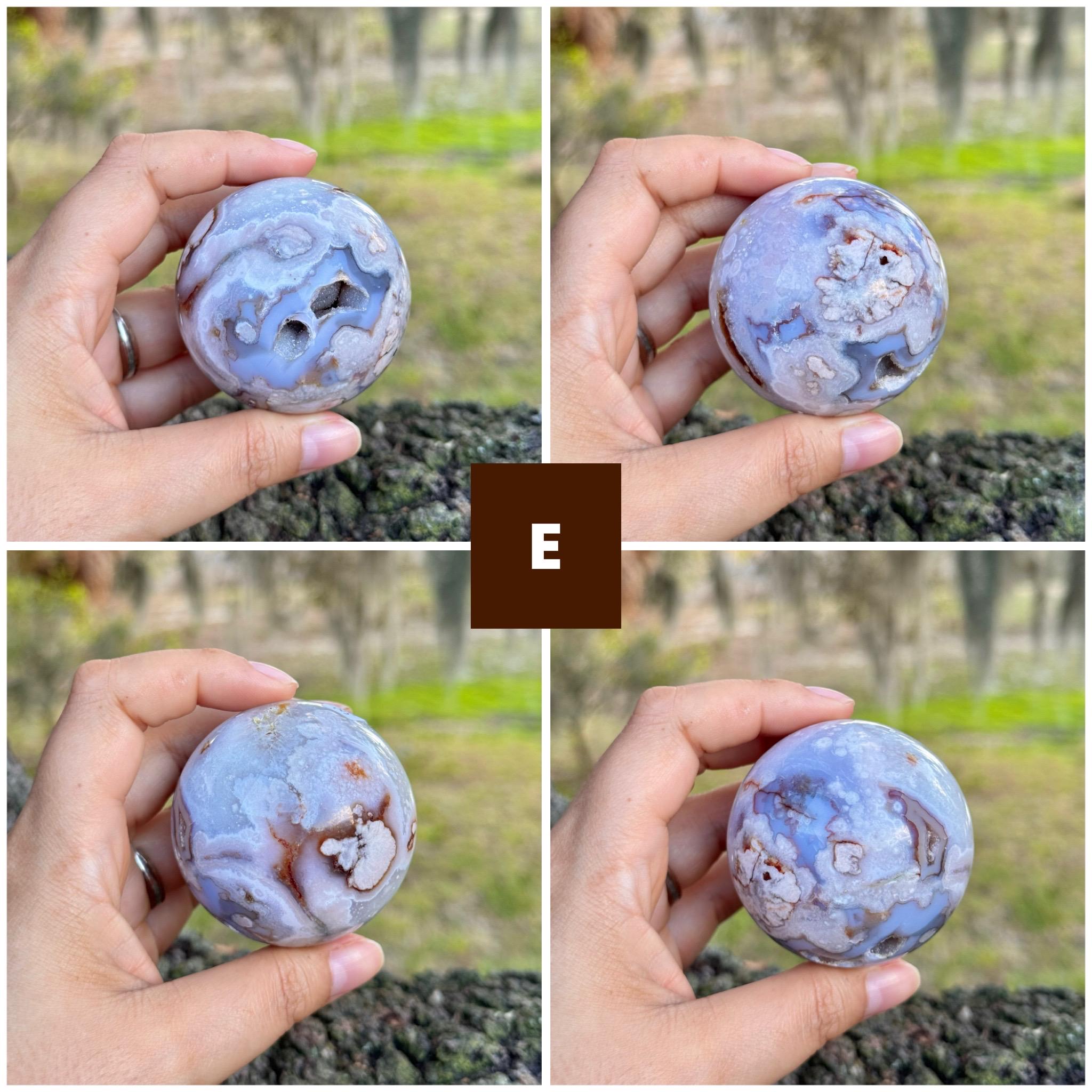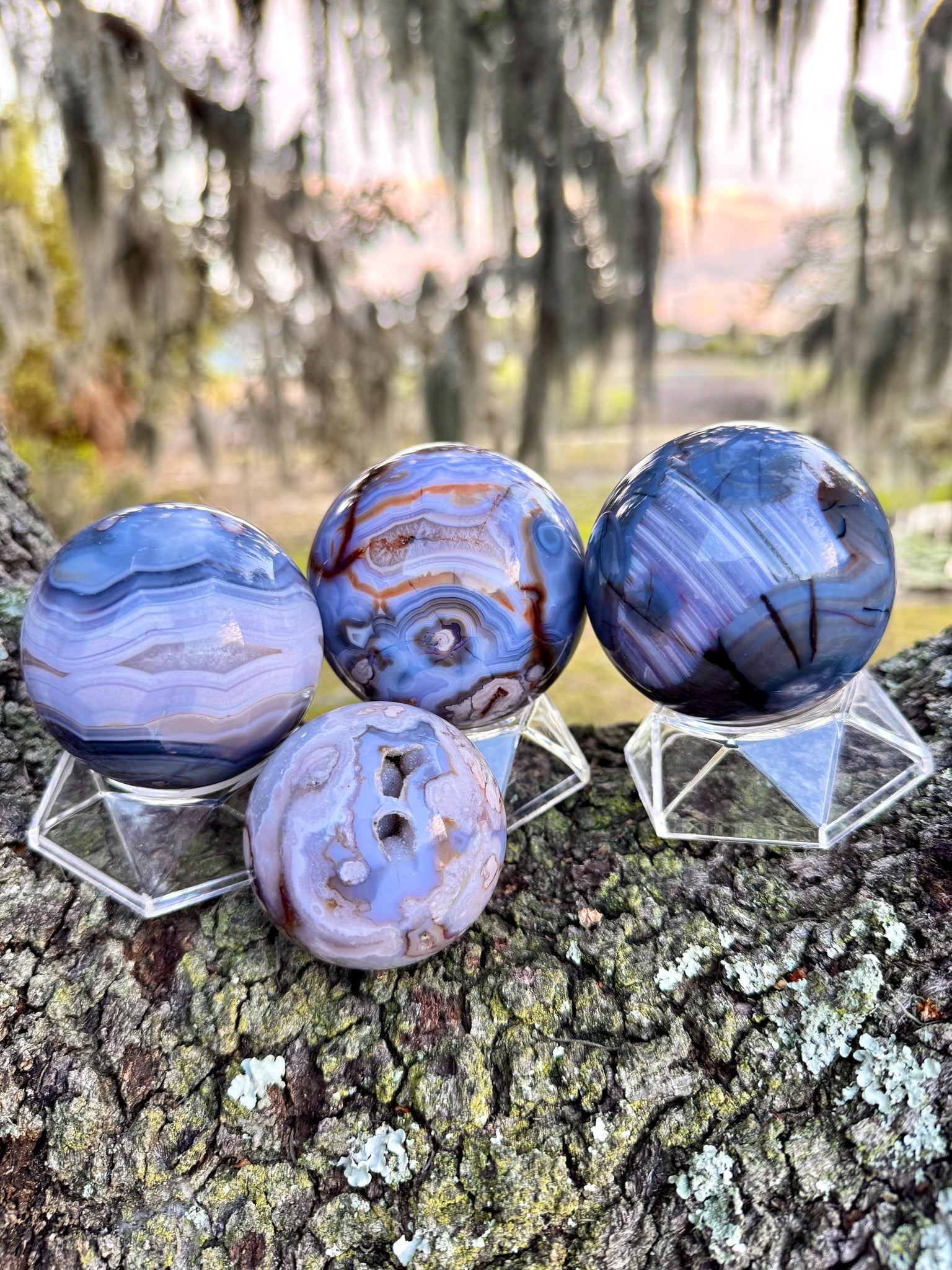 These stunning Blue Flower Agate spheres feature beautiful flowing bands of soft blue chalcedony with natural iron-rich inclusions and occasional druzy pockets. Each sphere has mesmerizing layered patterns resembling blooming flowers or drifting clouds, making them incredible pieces for collectors, crystal lovers, or home décor.